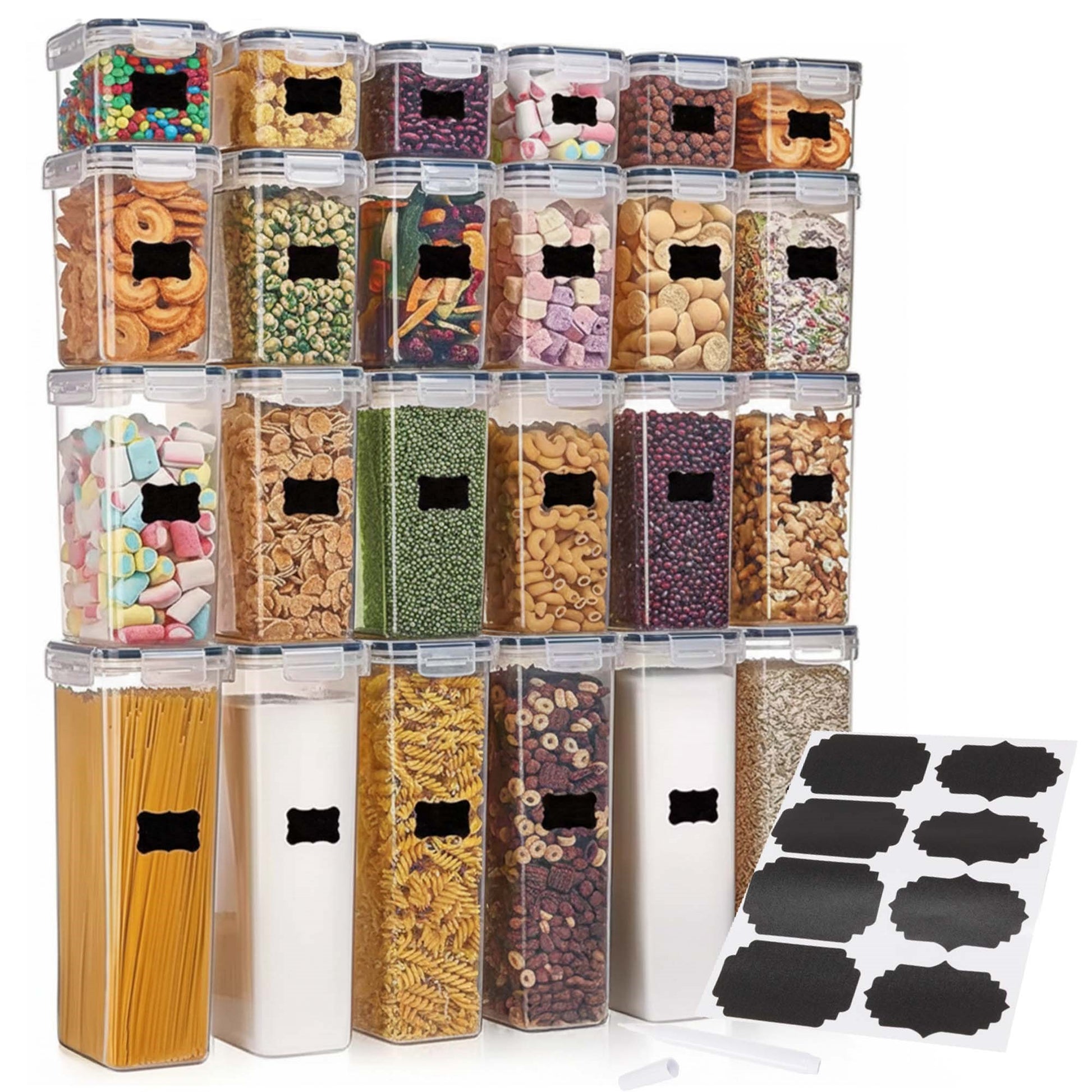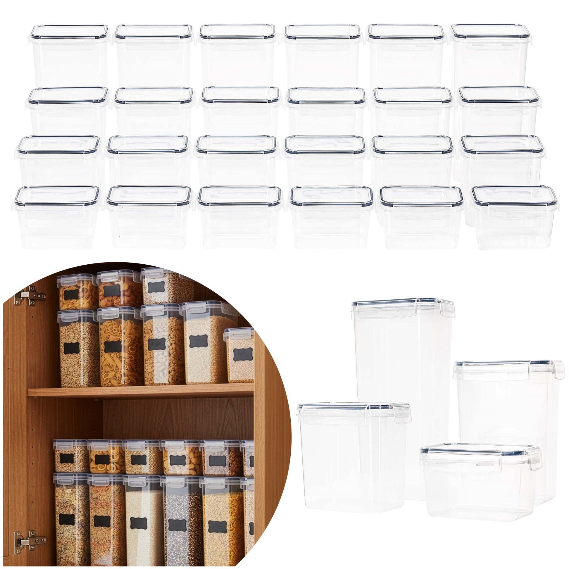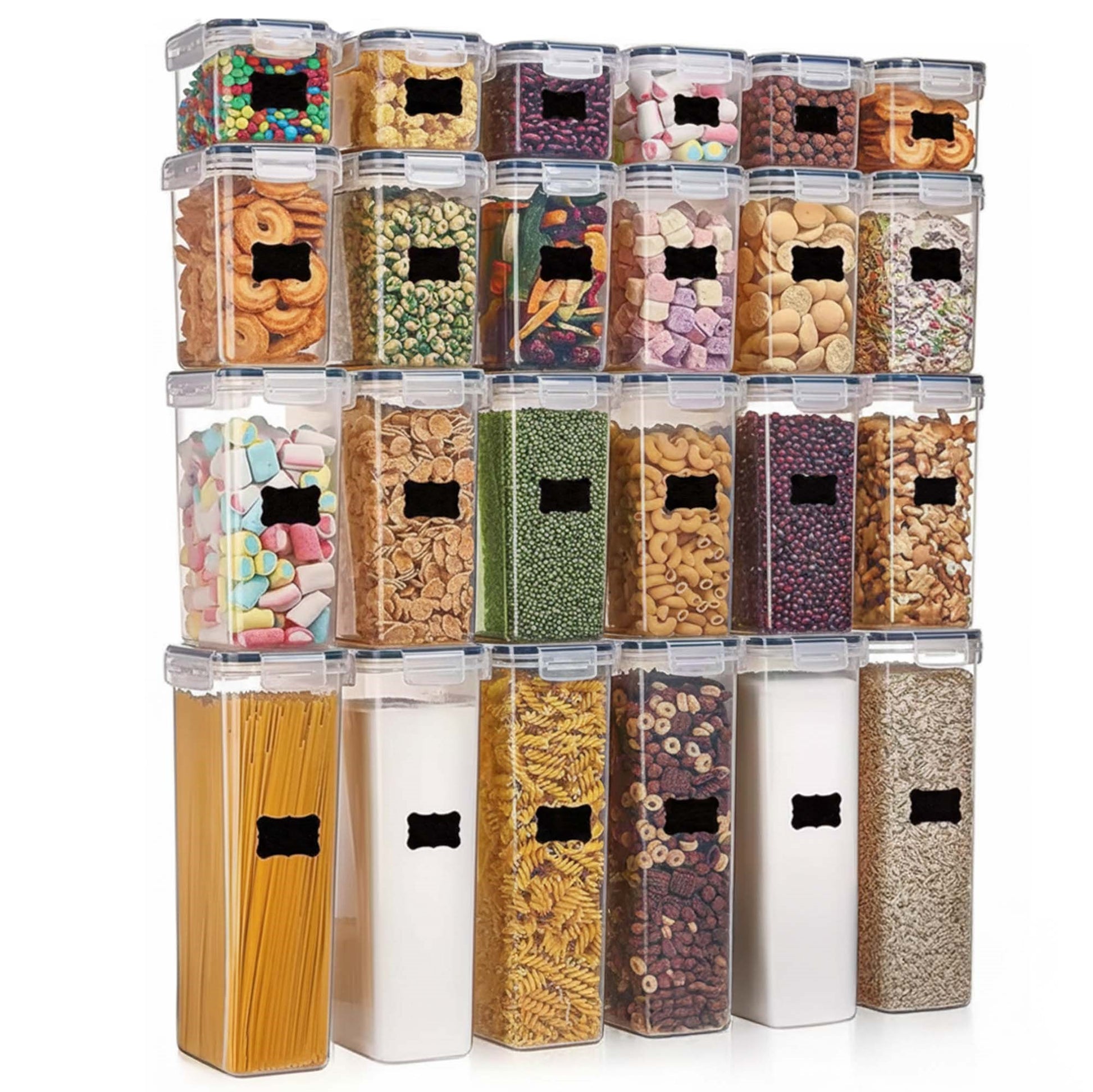 Šis funkcionalus maisto konteinerių rinkinys – puikus sprendimas tvarkingai ir patogiai virtuvei. Net 24 skirtingų dydžių indai leidžia laikyti įvairius produktus: kruopas, makaronus, miltus, cukrų, riešutus ar kitus sausus bei birius maisto produktus. Skaidrus dizainas padeda greitai matyti turinį, o sandarūs dangteliai apsaugo nuo drėgmės, oro ir nešvarumų.