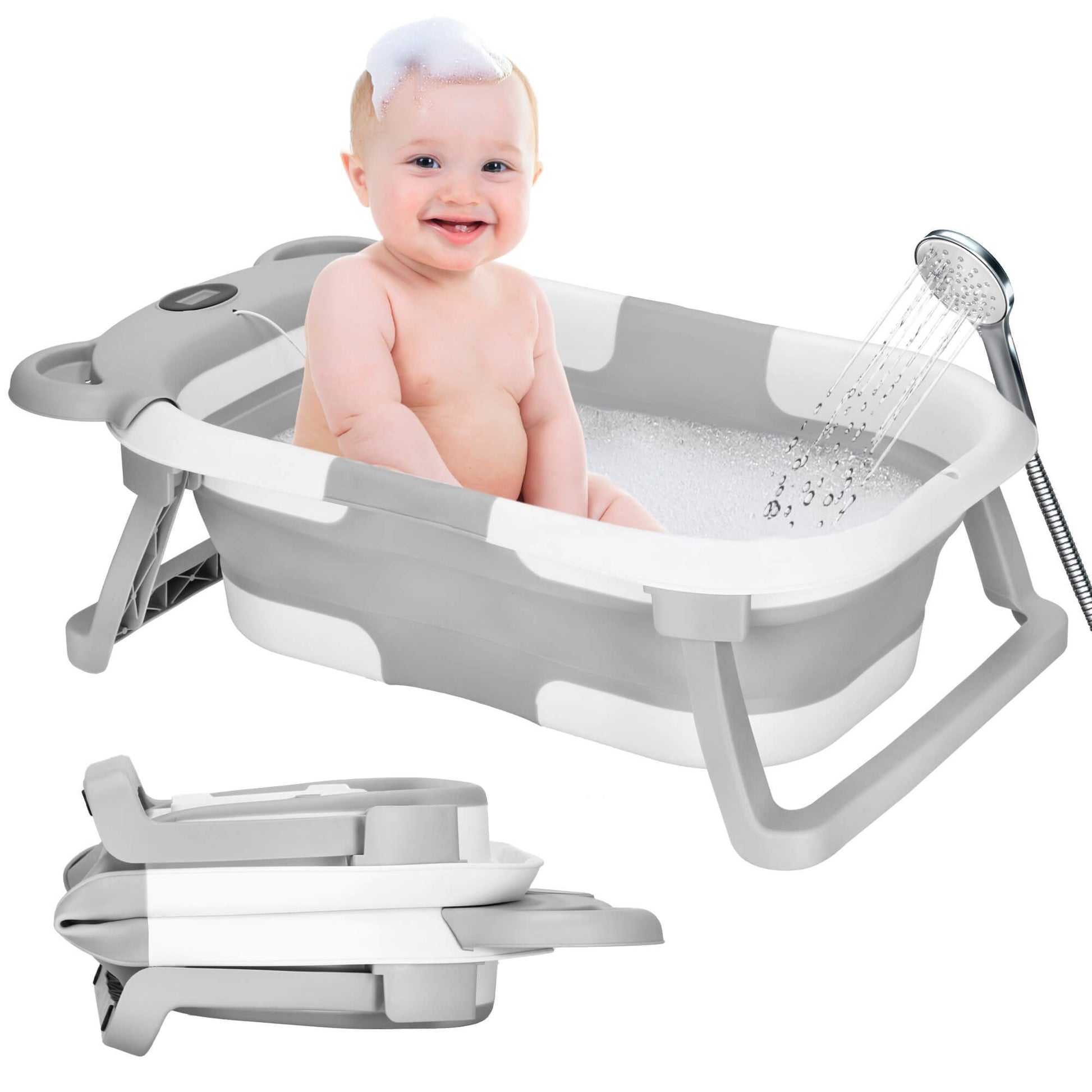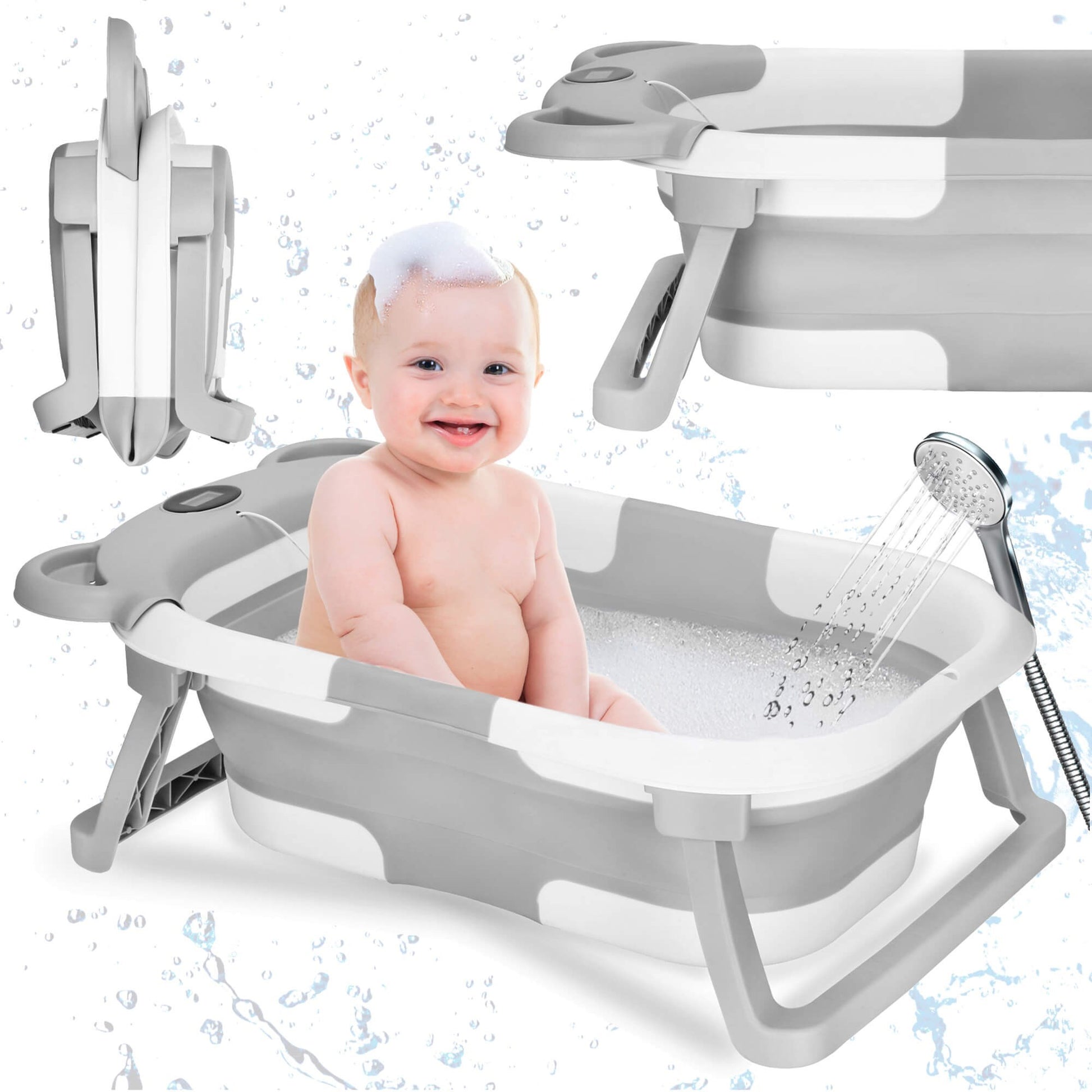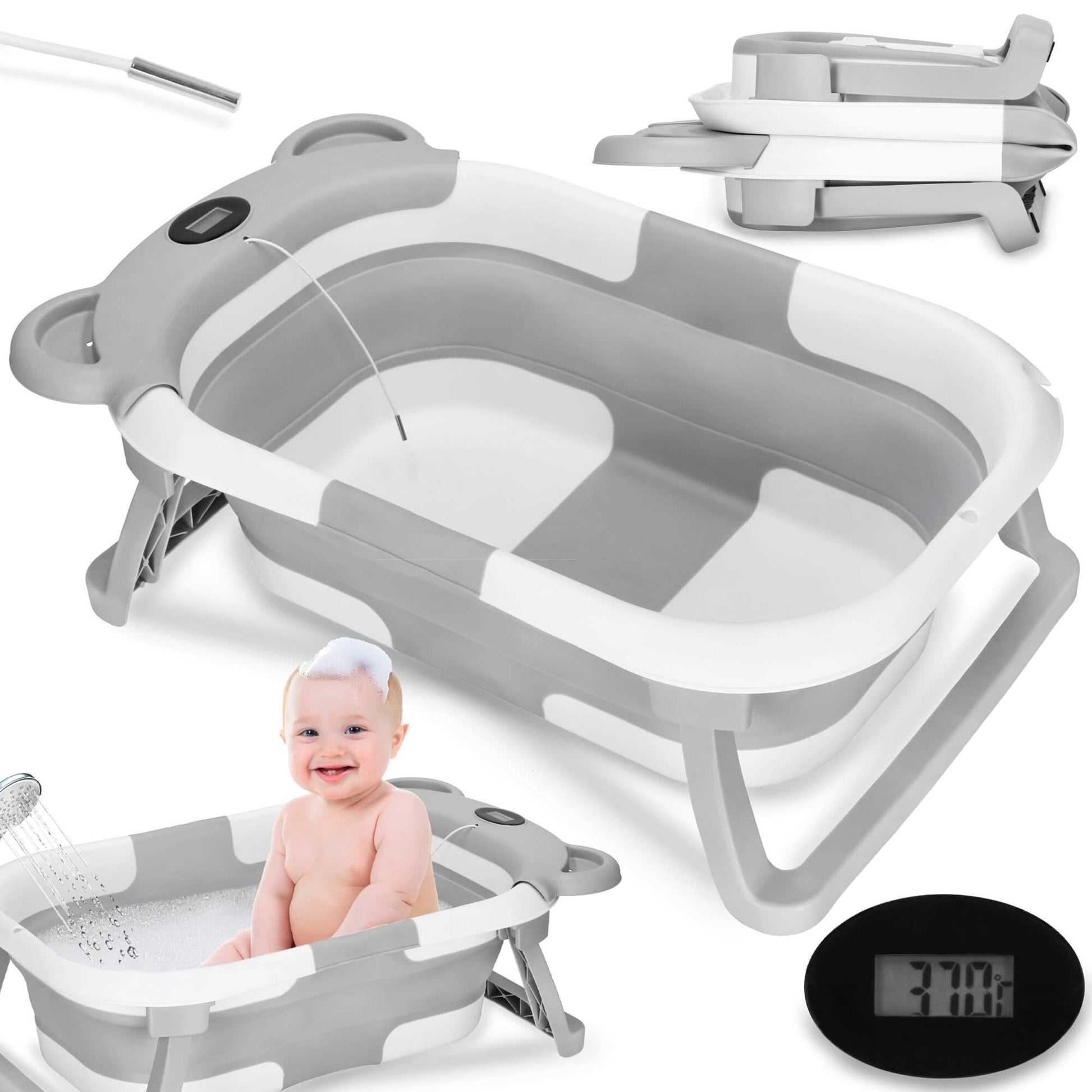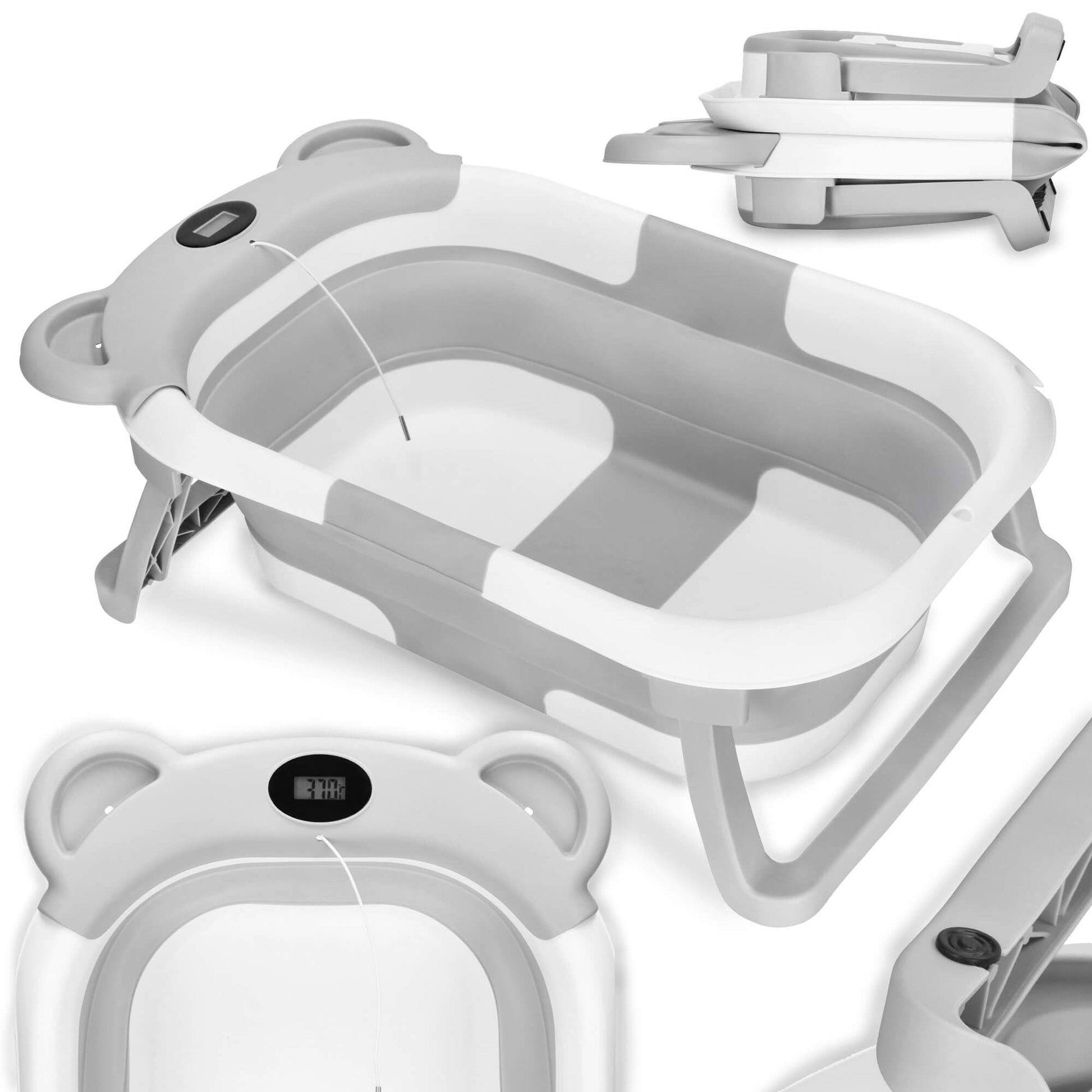 Sulankstoma kūdikio vonelė su termometru – kompaktiška, stabili ir puikiai tinka net mažiausiame vonios kambaryje ar kelionėse.