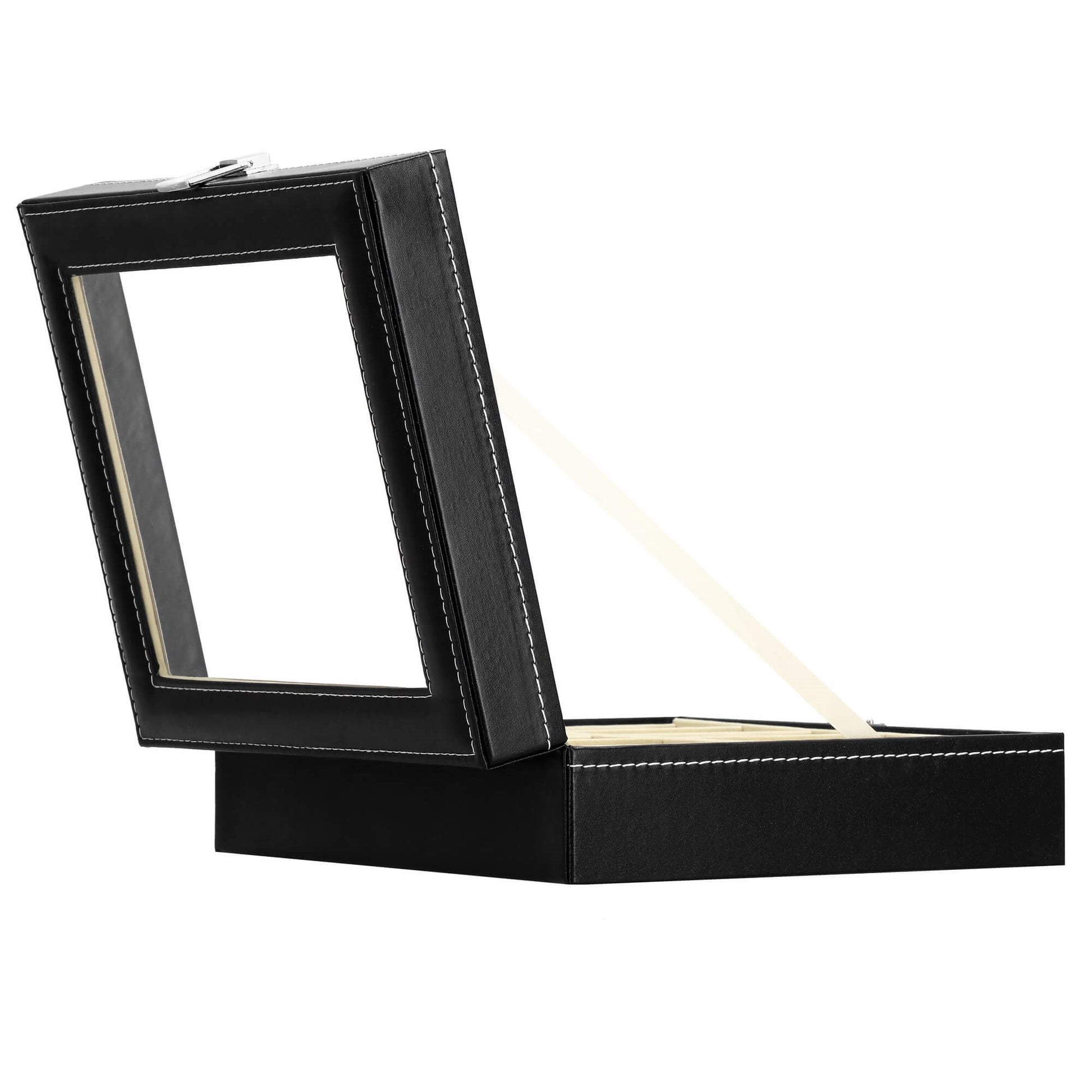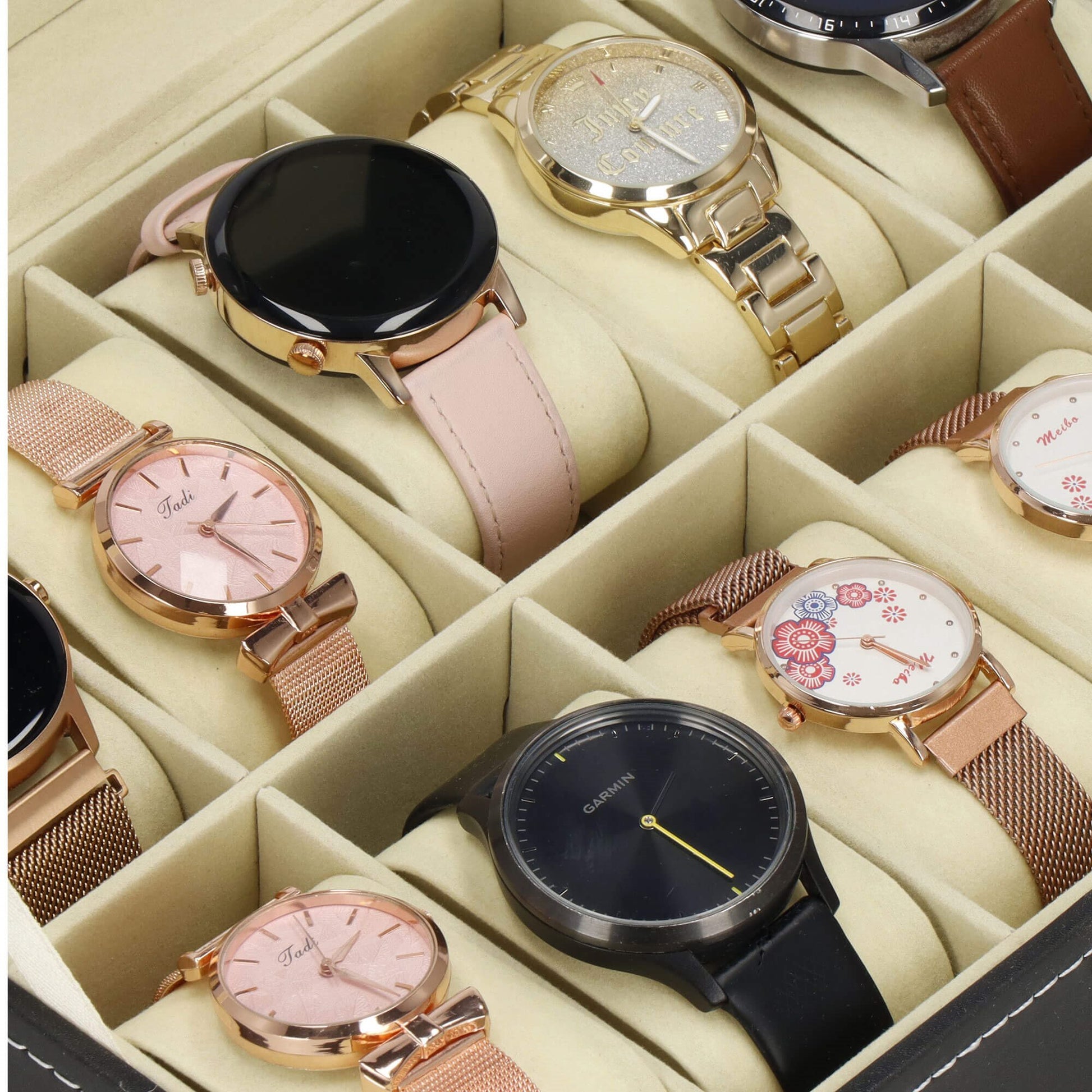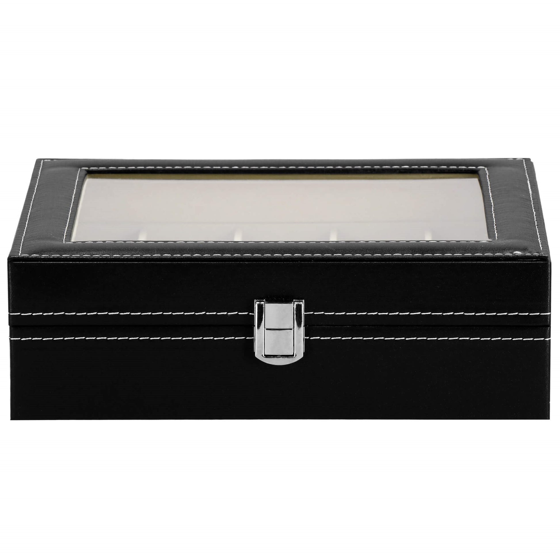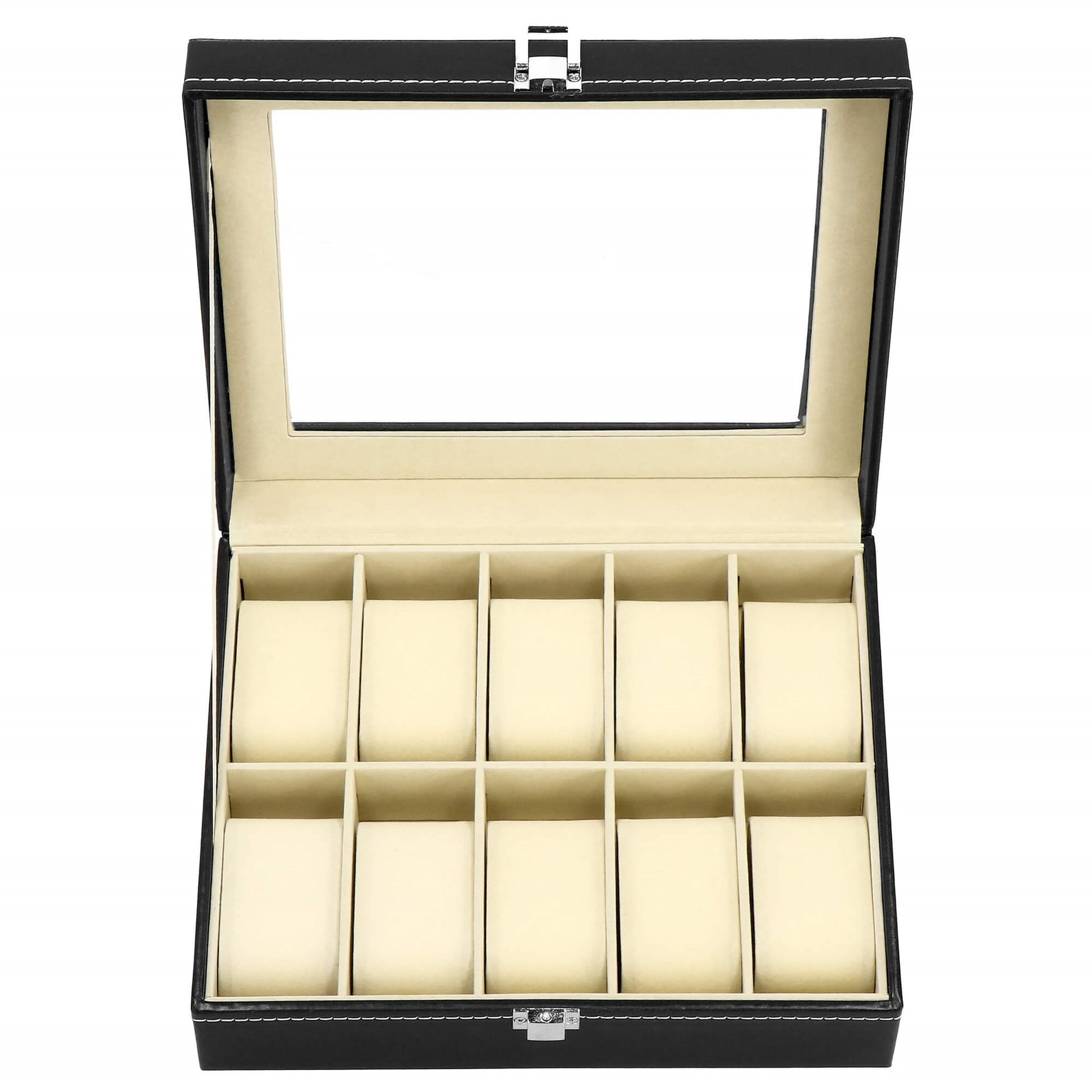 Elegantiška dėžutė su 10 laikrodžių vietų. Tvirta MDF + ekologiška oda konstrukcija su zomšiniu vidumi užtikrina laikrodžių saugumą. Patogus segtuko tipo užsegimas su raktu leidžia laikyti laikrodžius tvarkingai namuose ar kelionėje.
