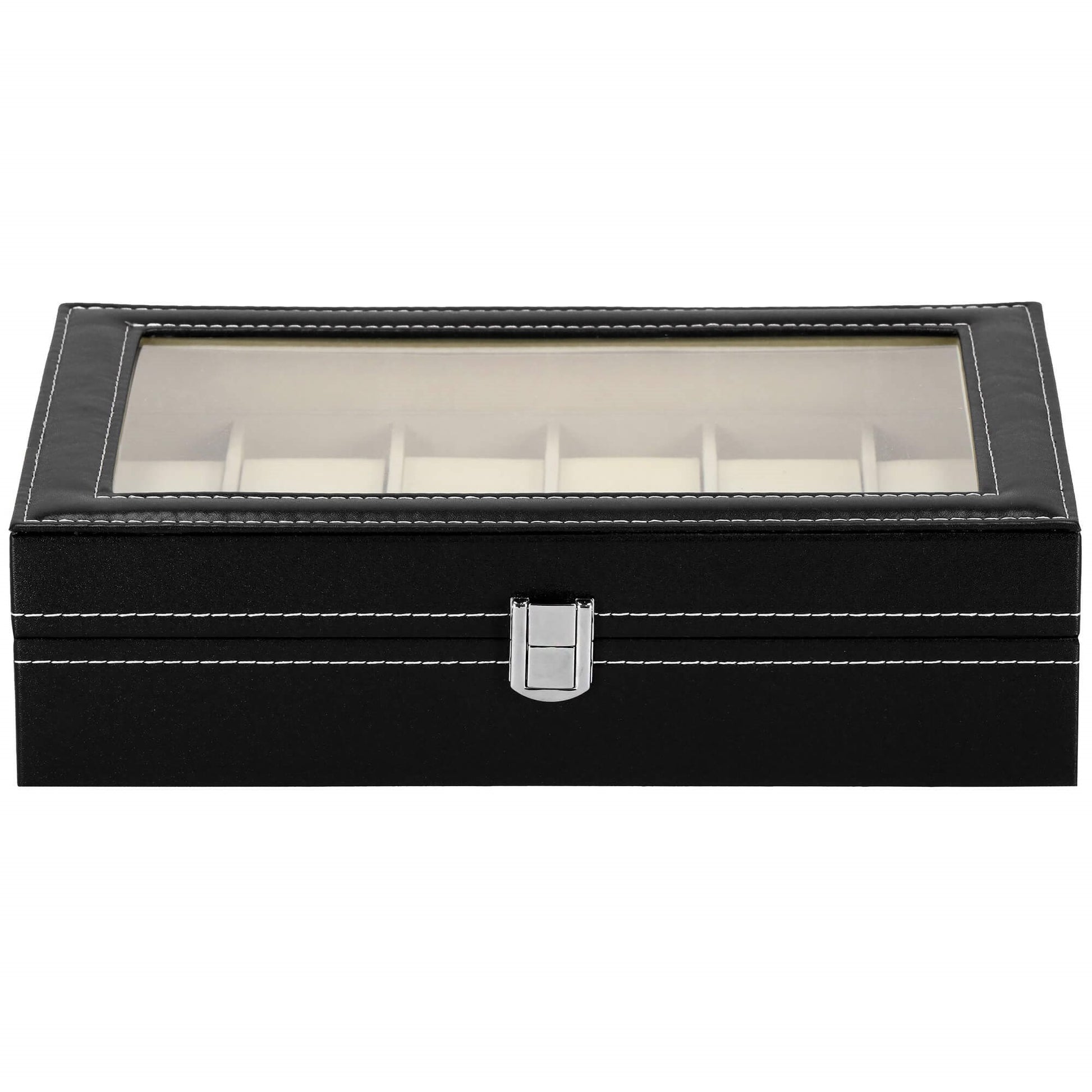 Stilinga dėžutė 12 laikrodžių su permatomu langu. Zomšinis vidus saugo laikrodžius nuo įbrėžimų, o MDF + eko oda suteikia tvirtumo ir elegancijos. Sidabrinės sagties detalės suteikia papildomo komforto atidarant dėžutę. Puikus pasirinkimas laikyti laikrodžius tvarkingai namuose ar kelionėje.