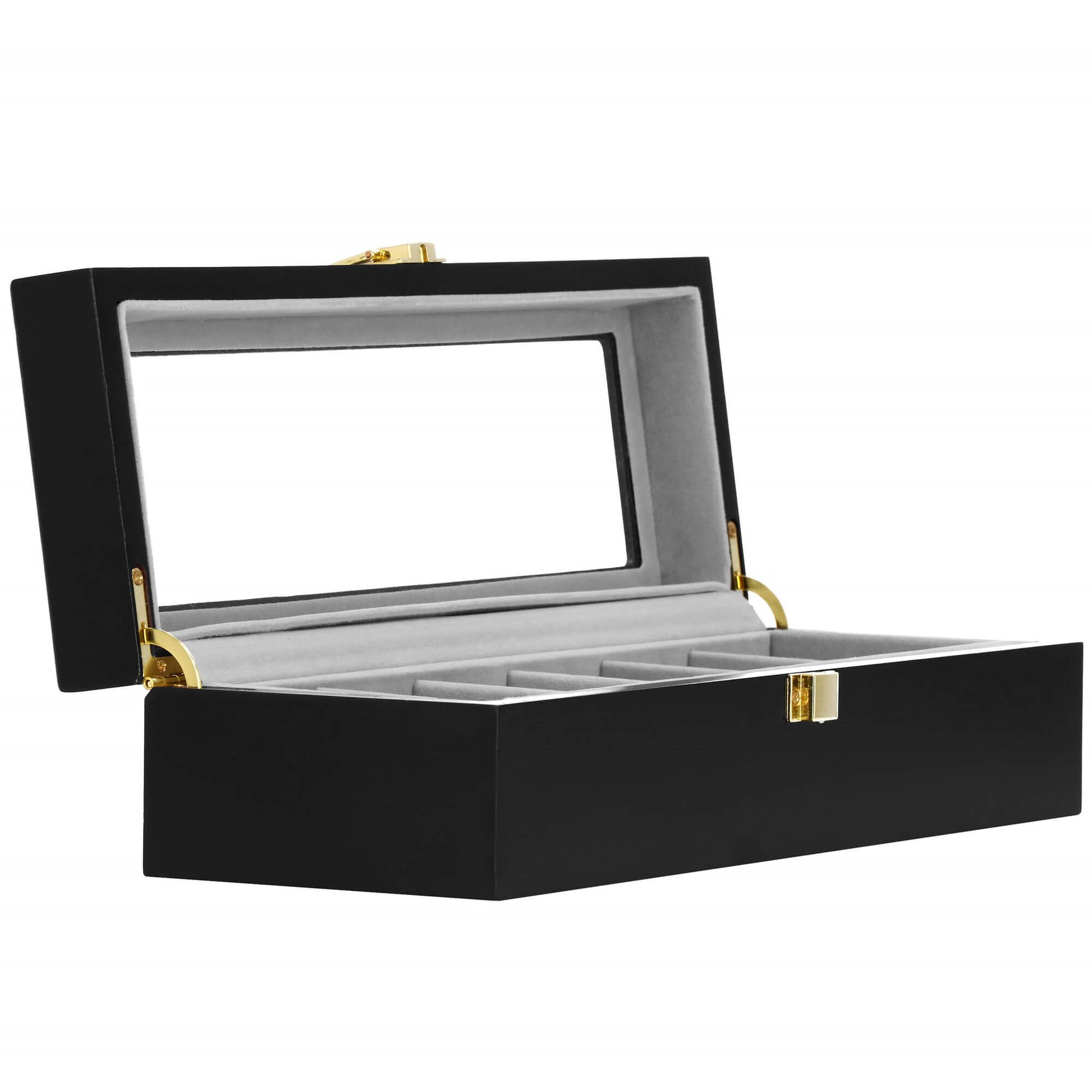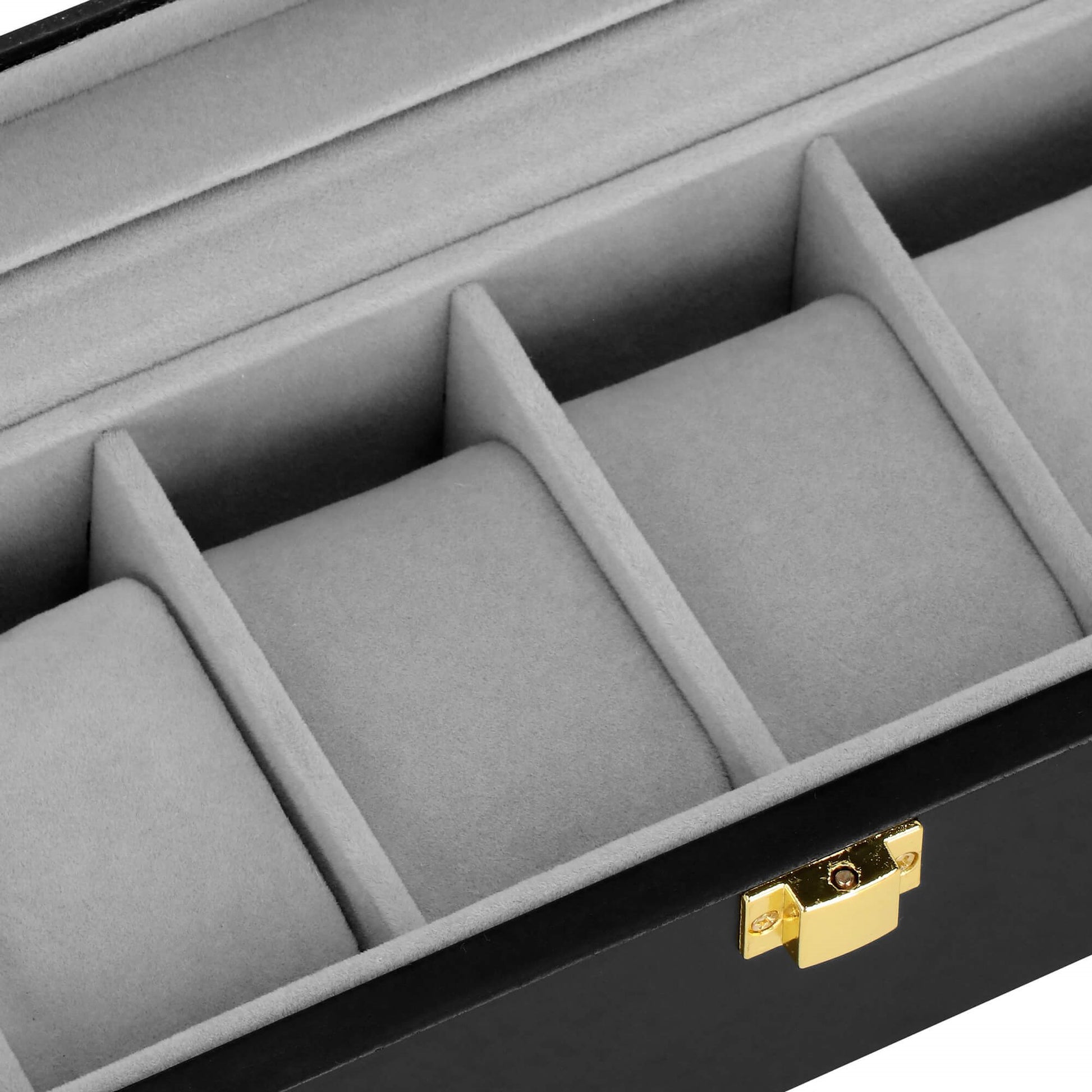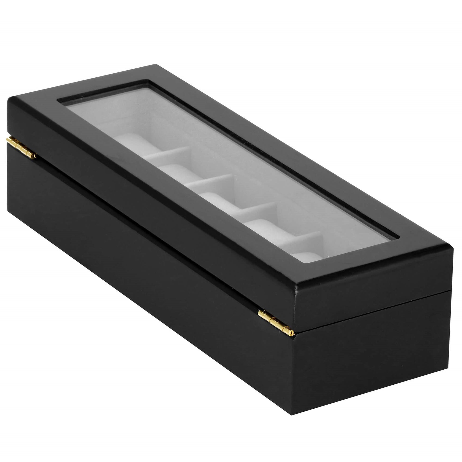 Stilinga dėžutė 6 laikrodžiams su permatomu langu, leidžiančiu patogiai peržiūrėti laikrodžius. Zomšinis vidus saugo laikrodžius nuo įbrėžimų, o auksinės aparatūros detalės suteikia prabangos pojūtį. Puikus pasirinkimas tvarkingai laikyti laikrodžius namuose ar kelionėje.