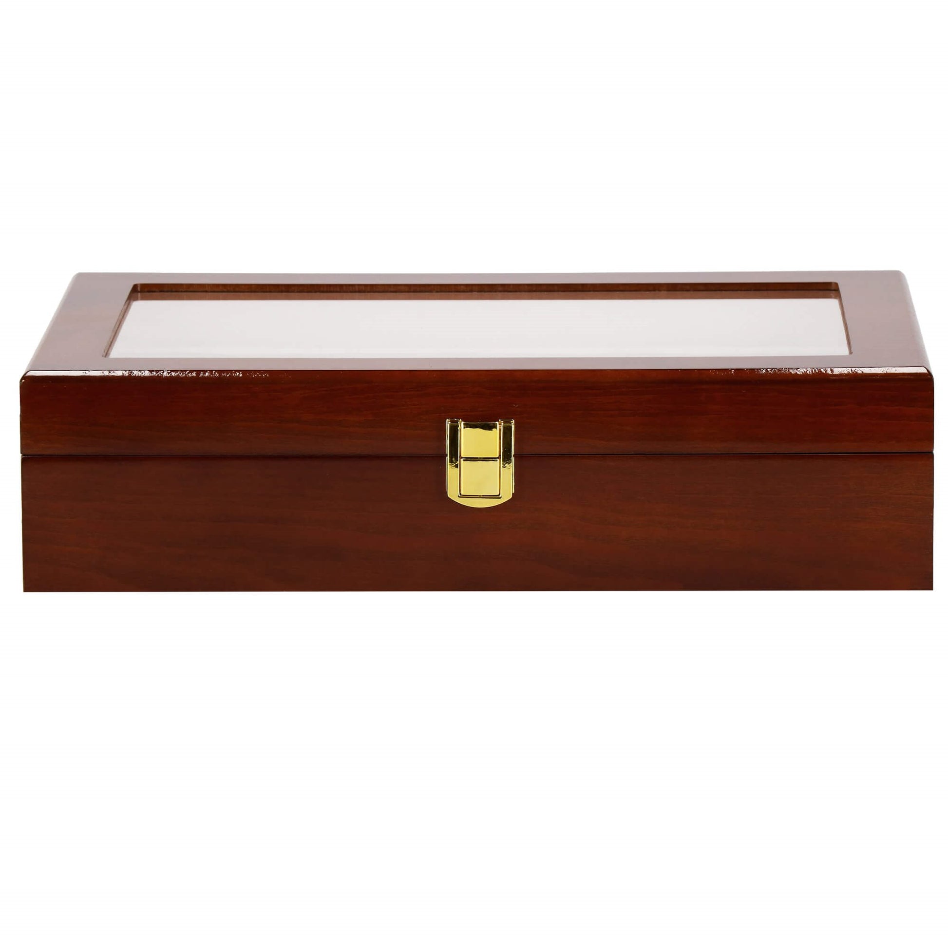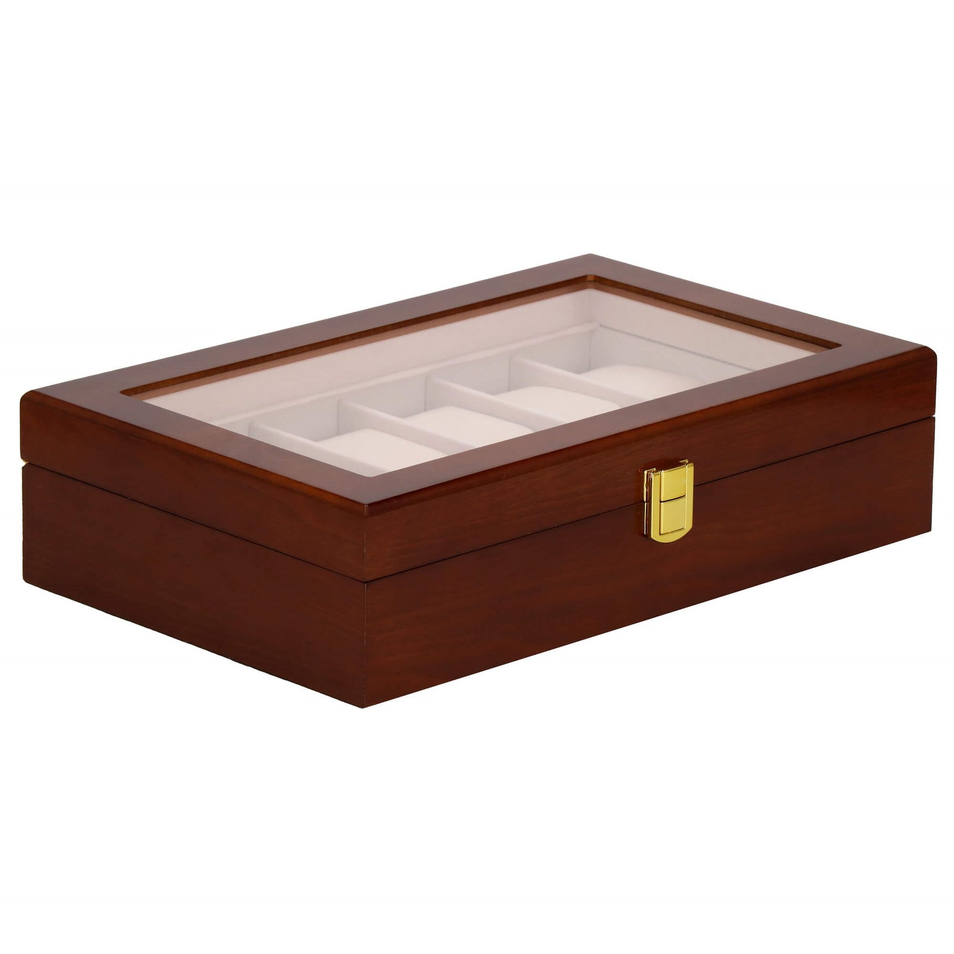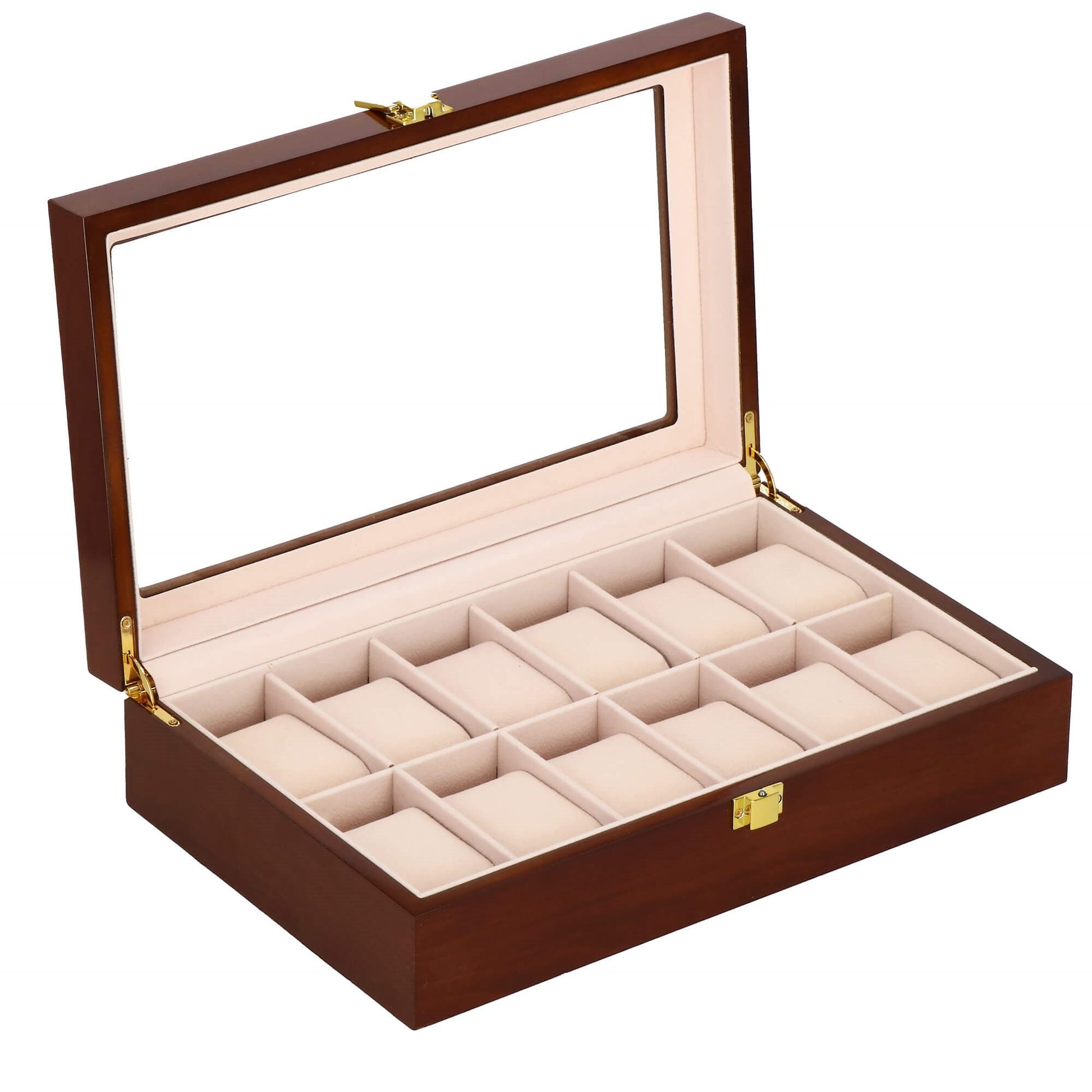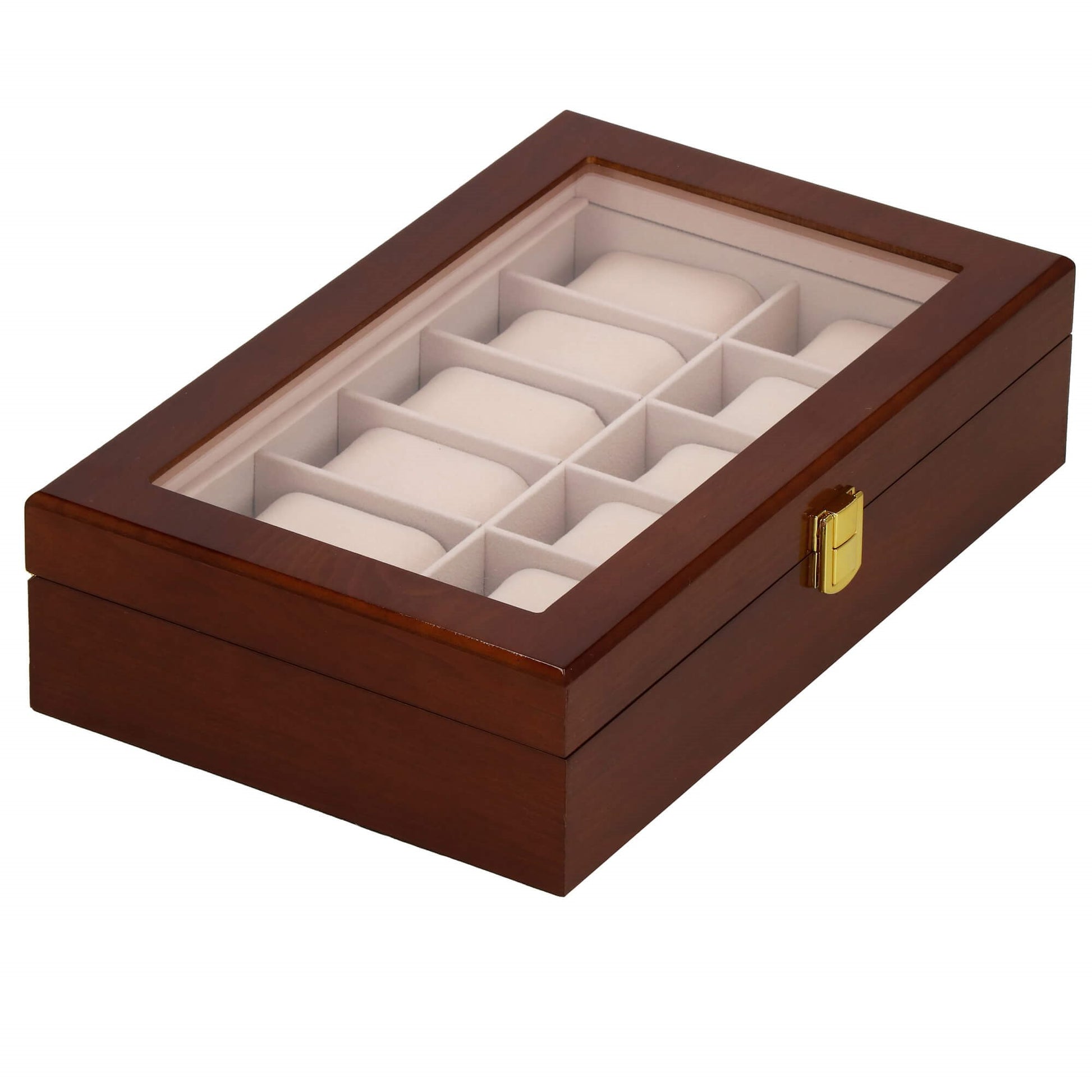 Stilinga medinė dėžutė 12 laikrodžių su zomšiniu vidumi ir permatomu langu. Aukso spalvos sagtis užtikrina saugų uždarymą, o šviesiai rožinis vidus apsaugo laikrodžius nuo įbrėžimų. Puikus sprendimas laikyti laikrodžius tvarkingai ir patogiai juos peržiūrėti.