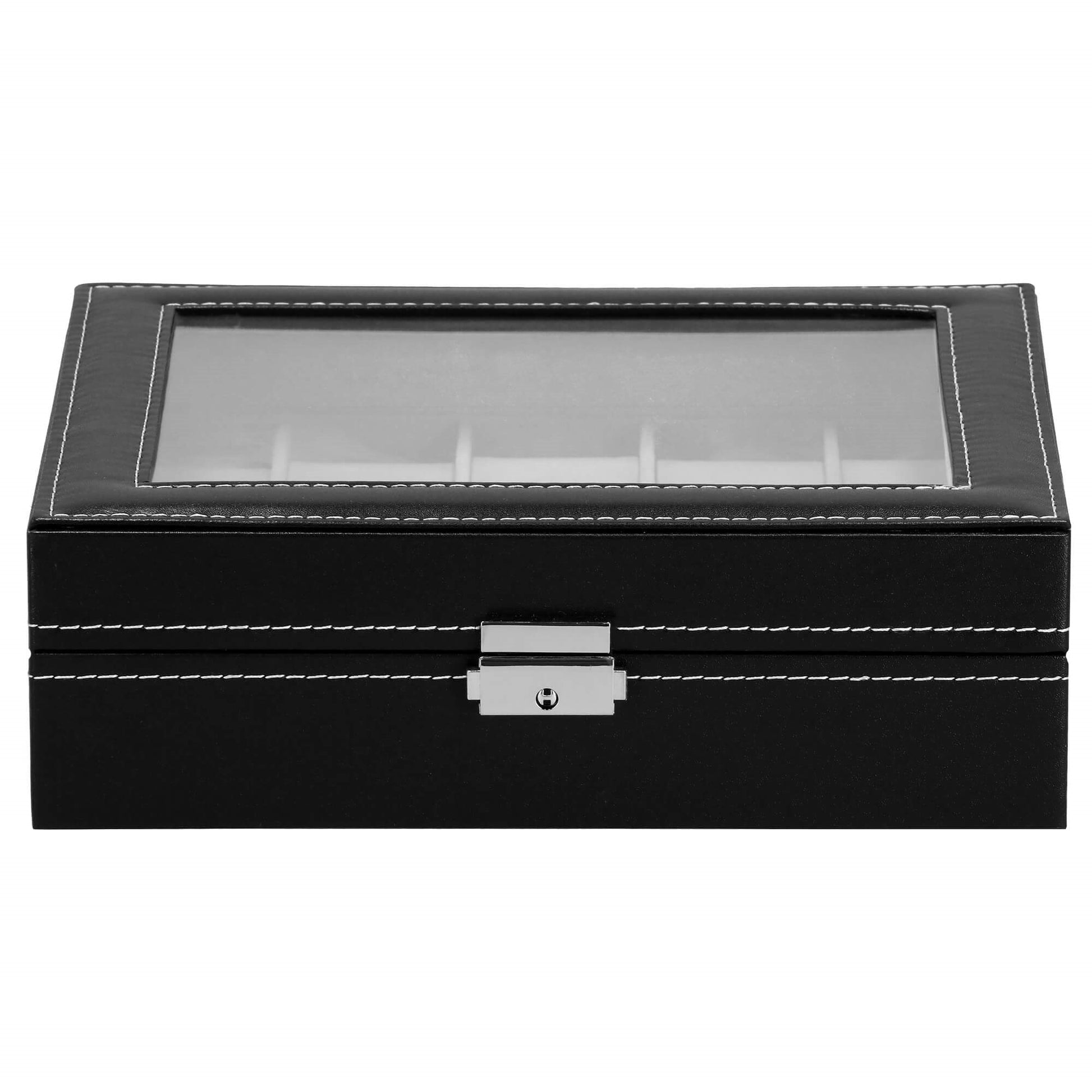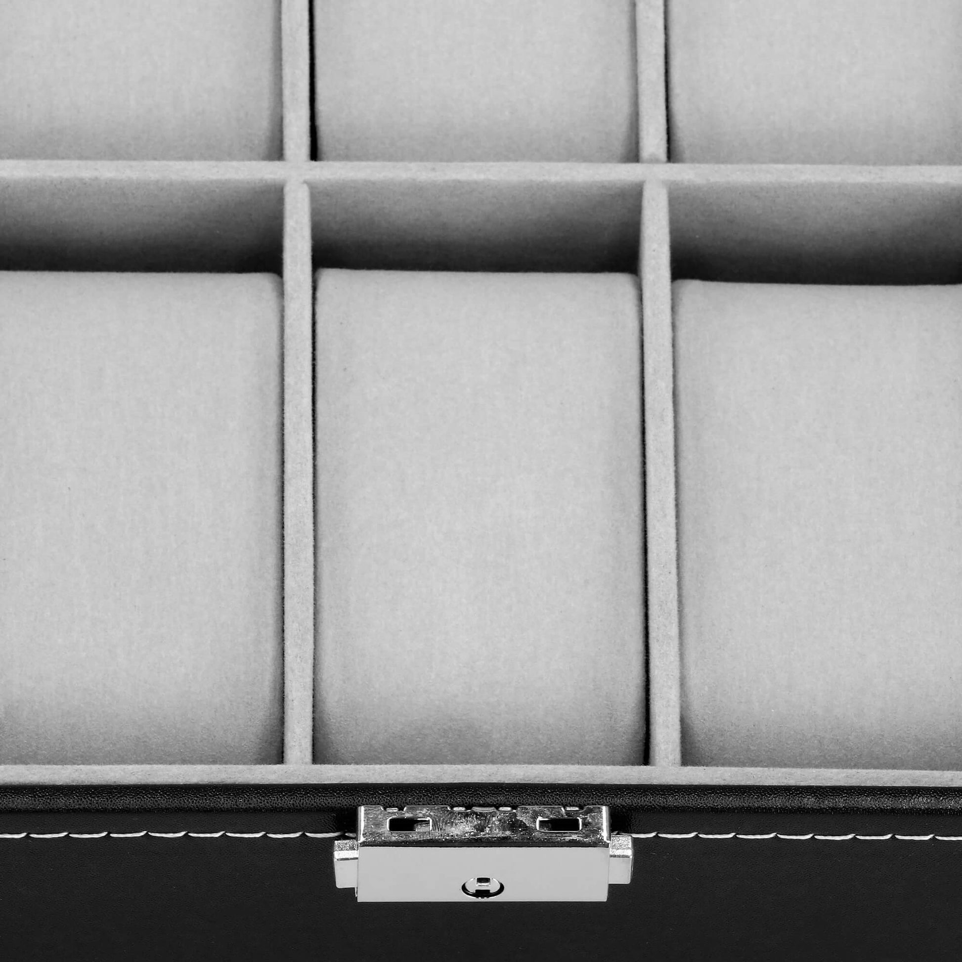 Elegantiška dėžutė 10 laikrodžių su zomšiniu vidumi. Tvirta MDF + ekologiška oda konstrukcija, užraktas su raktu užtikrina saugumą. Ideali laikyti laikrodžius tvarkingai namuose ar kelionėje.