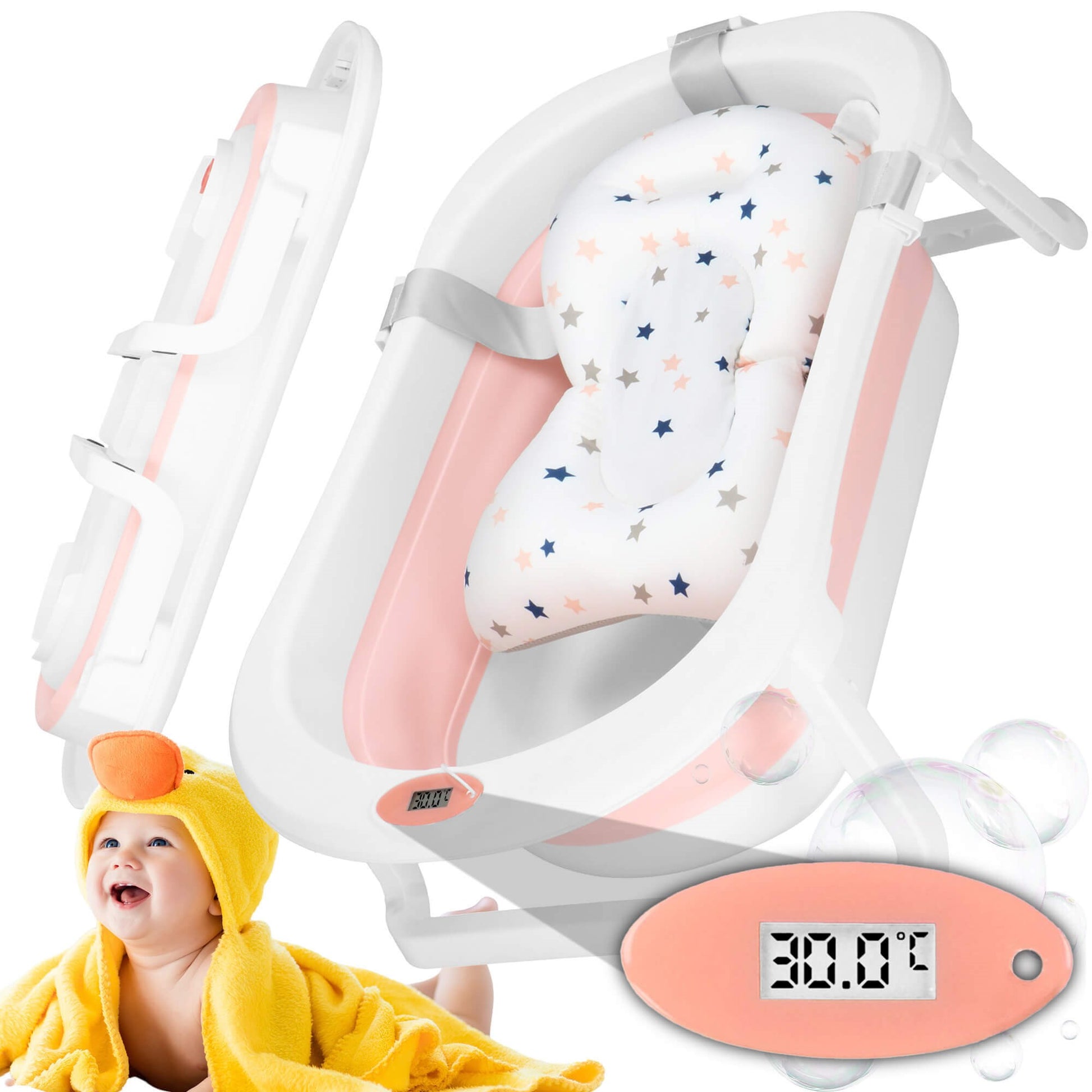 Nešiojama kūdikio vonelė SB0061 40 L balta-rožinė su kamščiu ir termometru