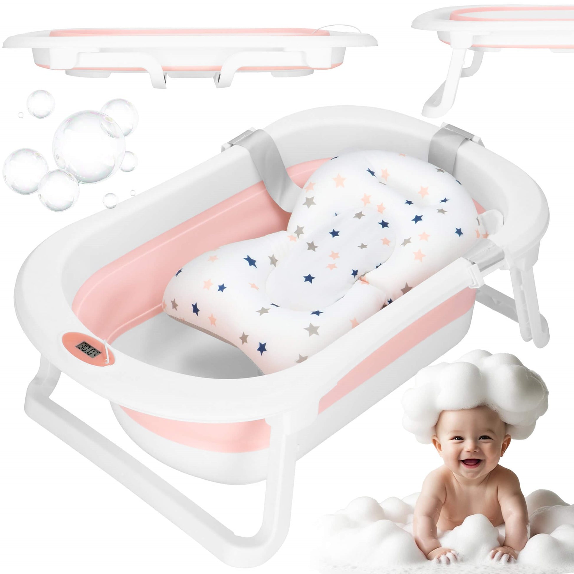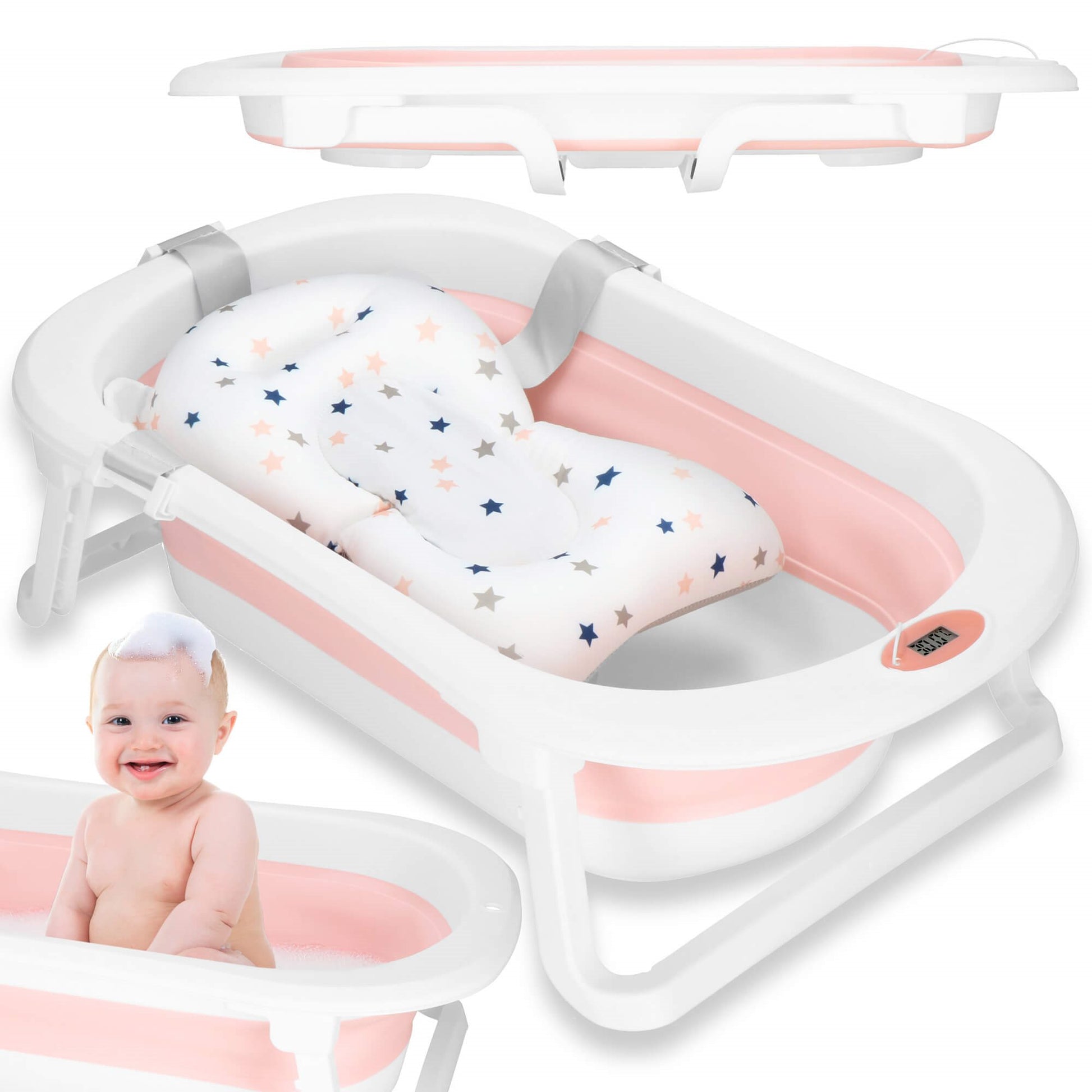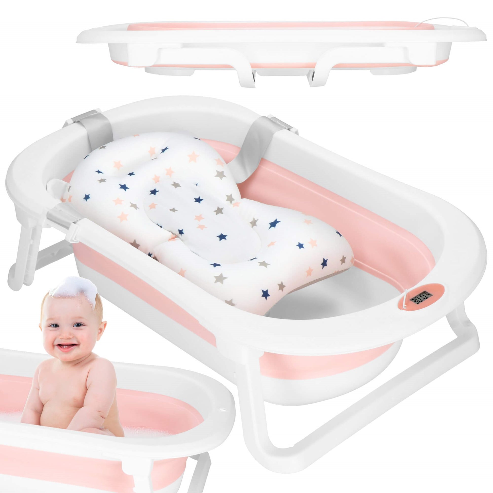 Sulankstoma kūdikio vonelė su įmontuotu termometru, spalvą keičiančiu kamščiu ir maudymosi pagalvėle – viskas, ko reikia patogiam ir saugiam maudymui.