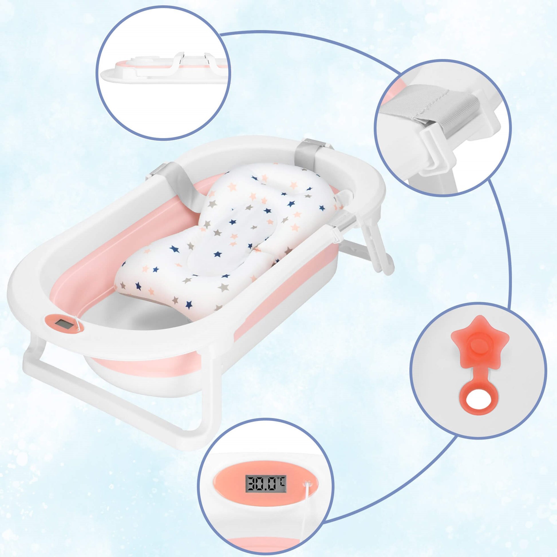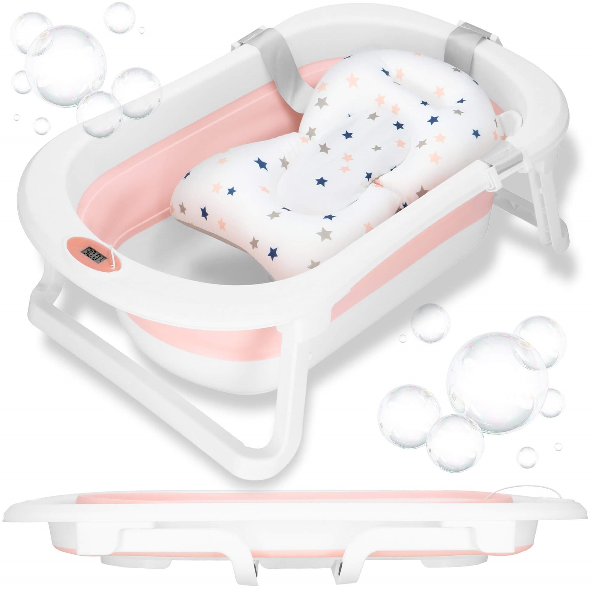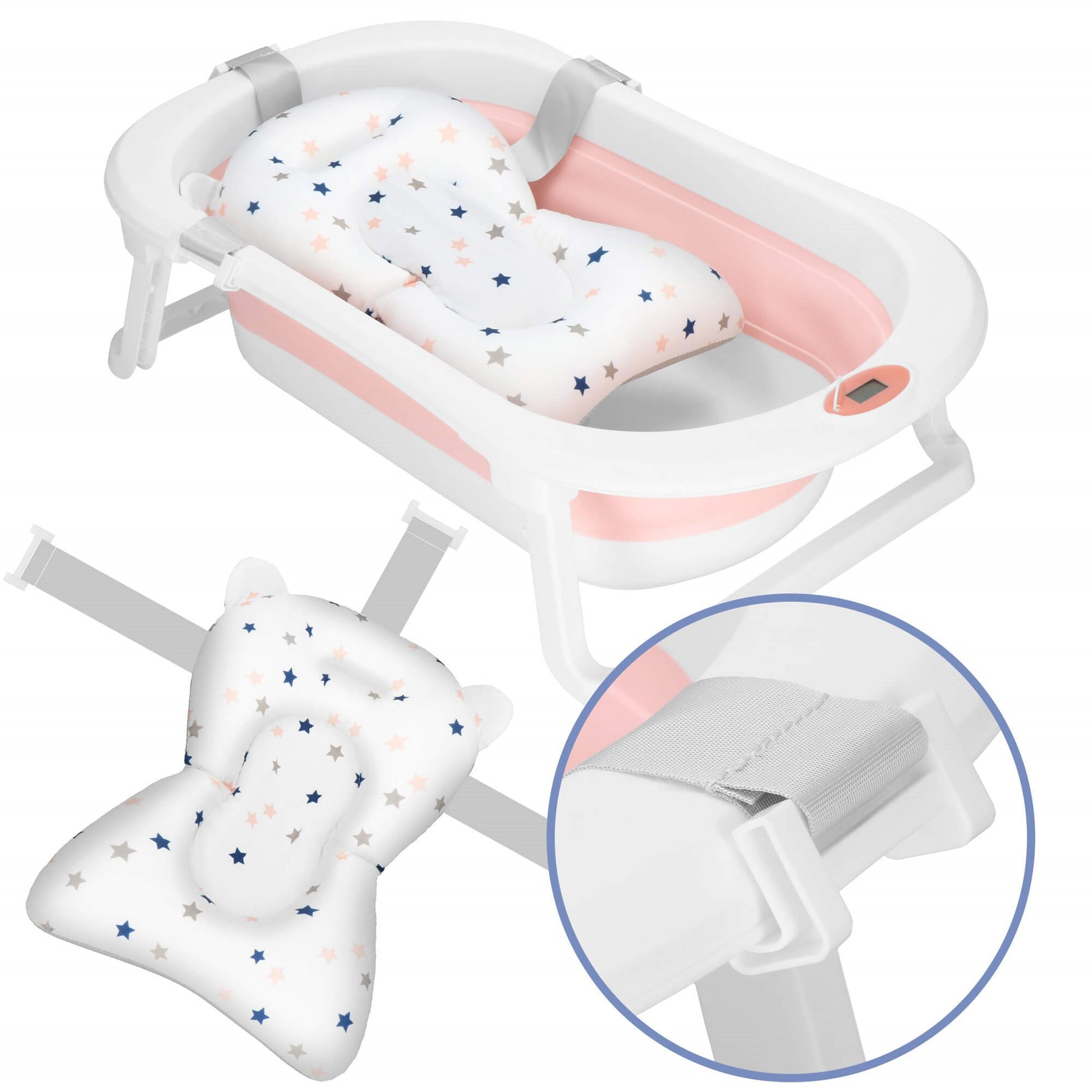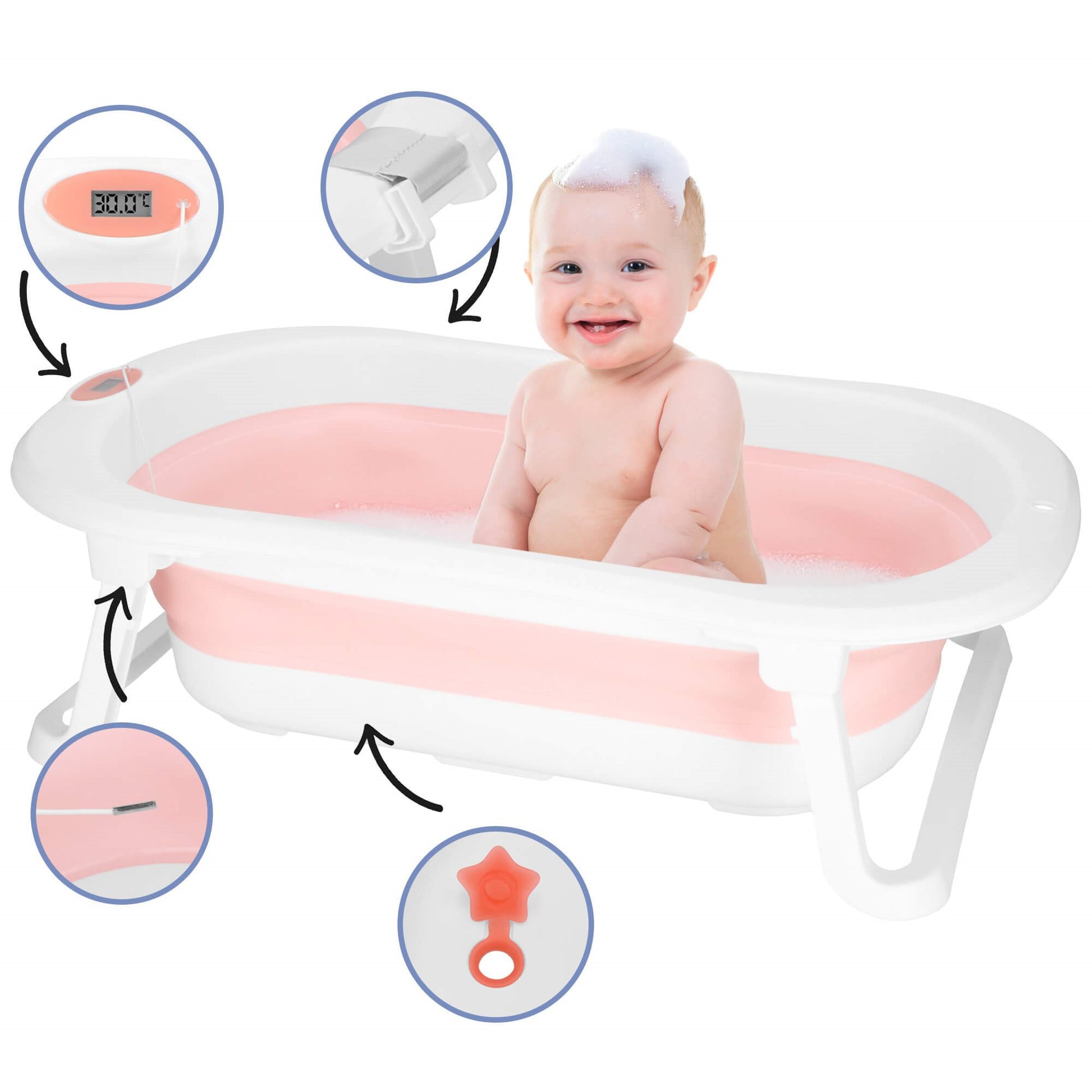 Sulankstoma kūdikio vonelė su įmontuotu termometru, spalvą keičiančiu kamščiu ir maudymosi pagalvėle – viskas, ko reikia patogiam ir saugiam maudymui.