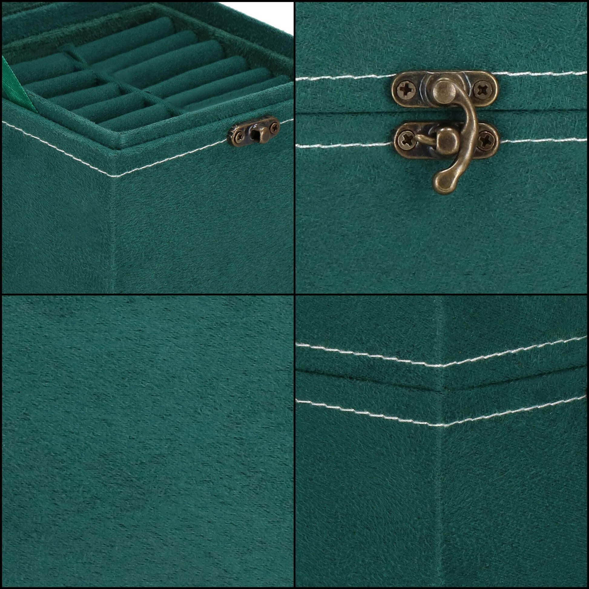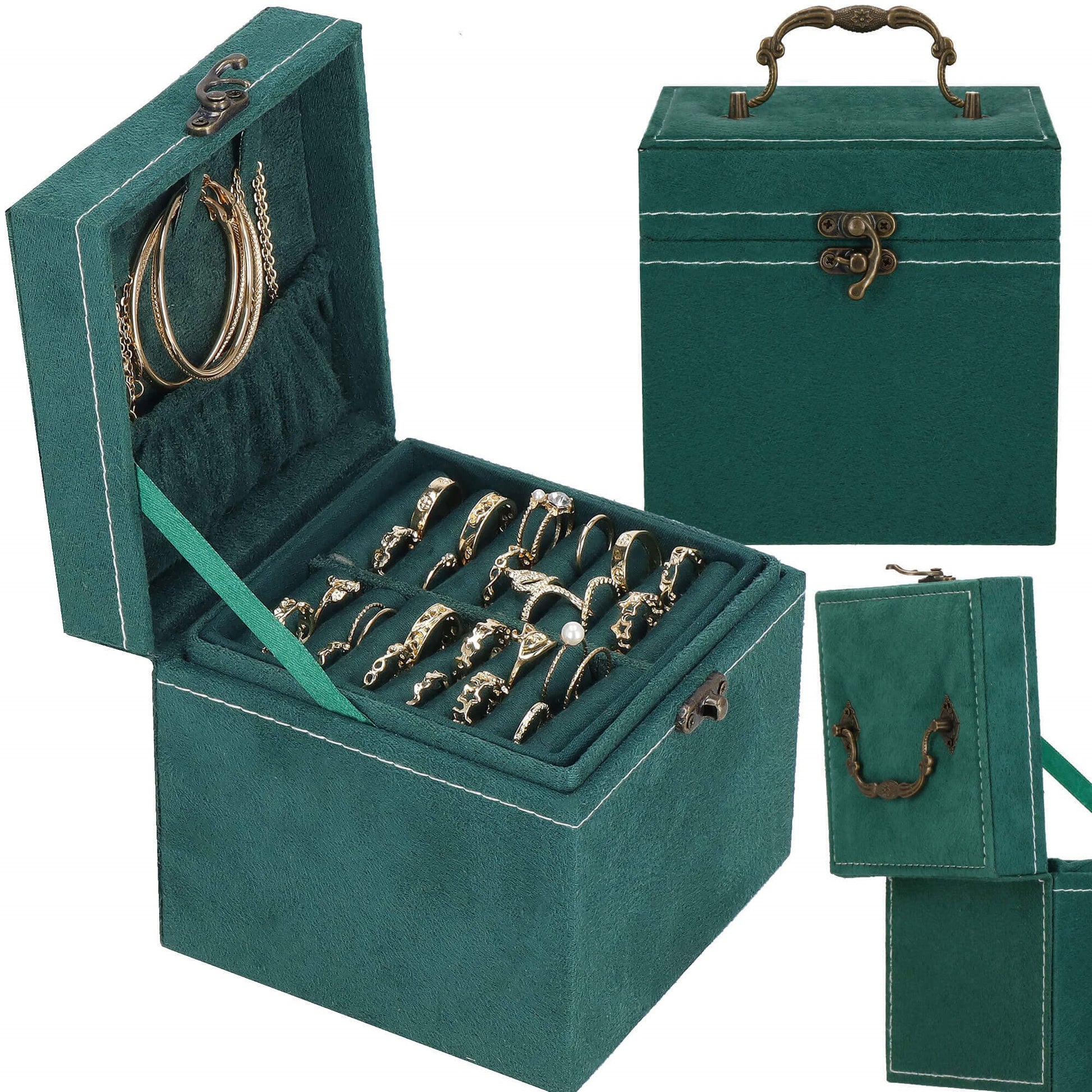 Elegantiška papuošalų dėžutė aksominio audinio, skirta tvarkingai laikyti žiedus, auskarus ir kitus smulkius aksesuarus. Žalia spalva suteikia prabangos ir rafinuoto stiliaus įspūdį. Dėžutė turi patogias lentynas ir skyrelius, kad visi papuošalai būtų tvarkingai išdėstyti.