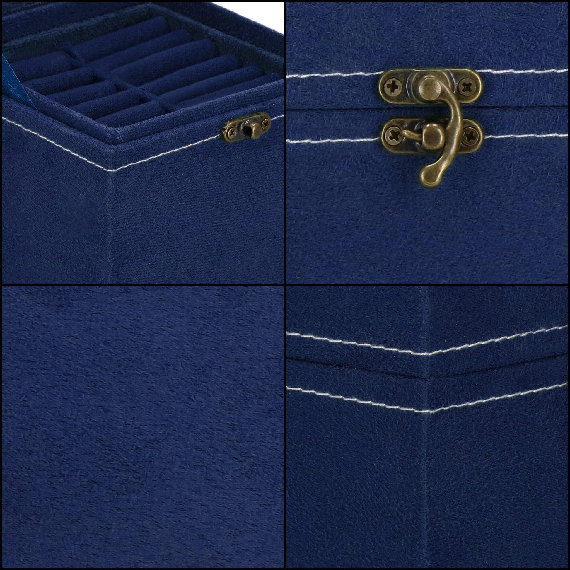 Elegantiška ir kompaktiška laikrodžių dėžutė retro stiliaus iš aksomo tamsiai mėlynos spalvos su senovinio aukso detalėmis. Retro spyna ir rankena suteikia dėžutei ypatingo žavesio, o įvairūs skyreliai leidžia patogiai laikyti laikrodžius, grandinėles ir žiedus.